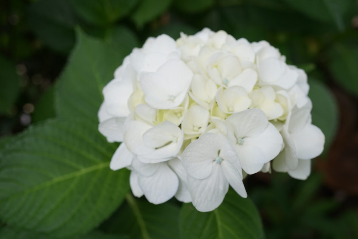 我家の庭には、私達よりずっと前からお住まいの、白くて大ぶりの花を咲かせる紫陽花がおります。直径20㎝程の手毬風で、気品と風格を備え、他の紫陽花たちとは一線を画しております。