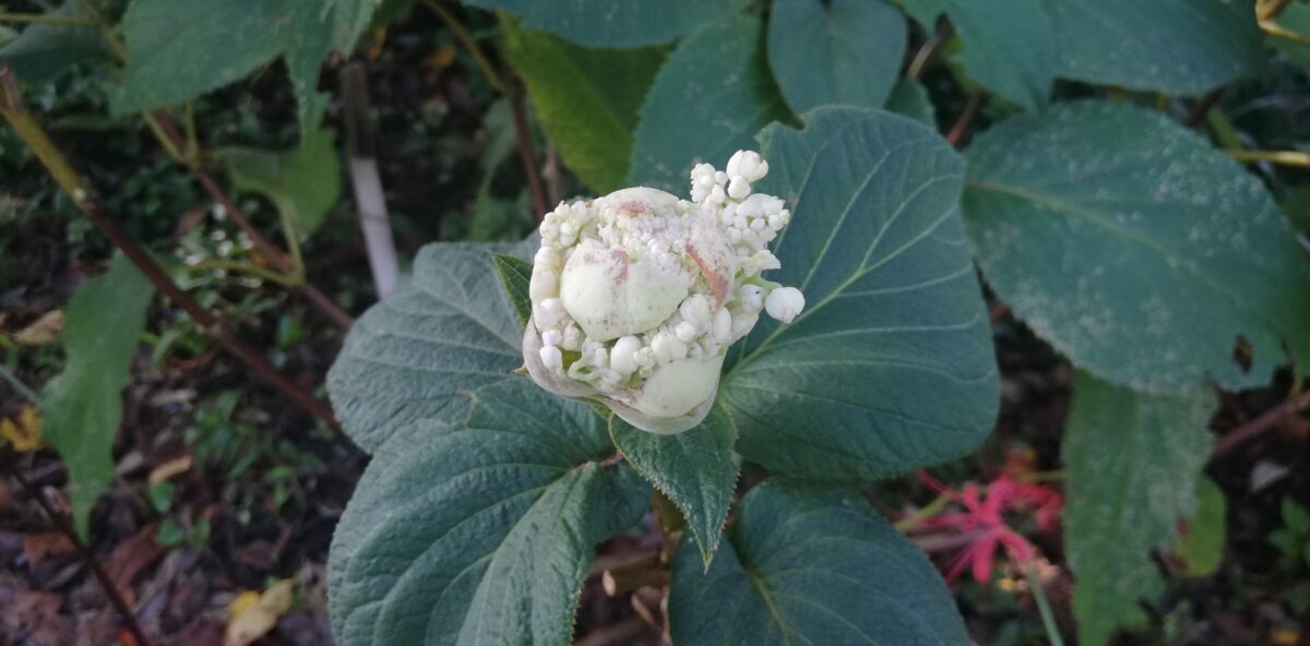 中央の写真右下に一緒に写っている赤い花は彼岸花です。玉紫陽花の葉や花の大きさがお分かり頂けるかと思います。